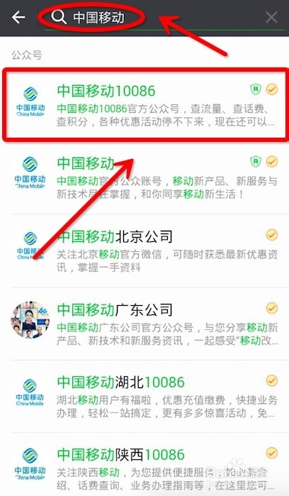 首先,打开微信,选择添加公众号,搜索“中国移动”,点击搜索结果的*个公众号后,点击“关注”