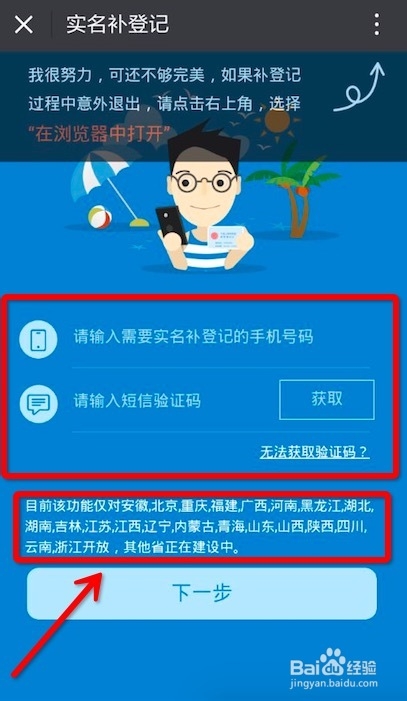 点击“开始使用”后,输入手机号码,输入短信验证码后,点击下一步。
