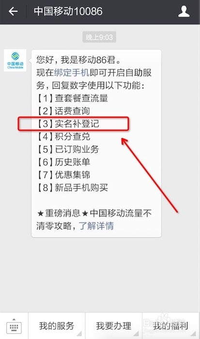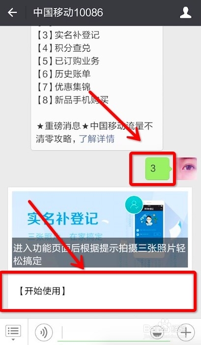 进入公众号后,按照提示,输入数字“3”,弹出实名登记链接。点击“开始使用”